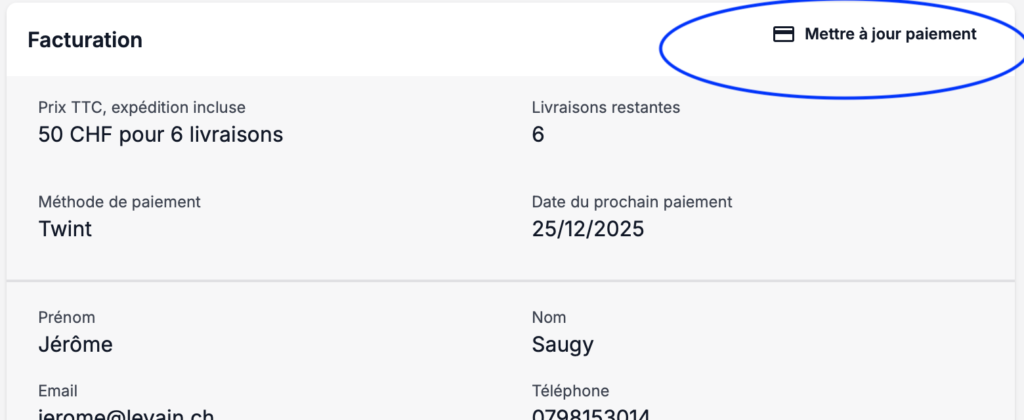 G) seules les cartes de débit / crédit (Mastercard, Visa), Postfinance pay et Twint permettent de régler l’abonnement (pour assurer la fonction de paiement récurrent)