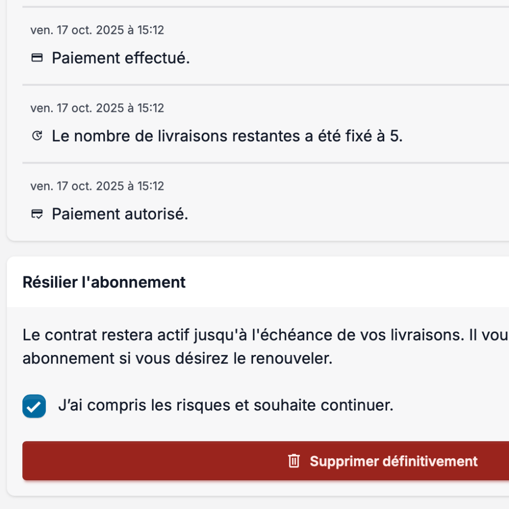 Que ce soit pour cause de vacances, réduire sa consommation, ou toute autre raison, il est possible de suspendre et reprendre les livraisons sans limite.