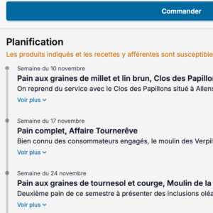 Les recettes changent chaque semaine et vous sont présentées sur la page de commande avec le calendrier des livraisons (accessible via le bouton "calendrier" sur votre compte client).